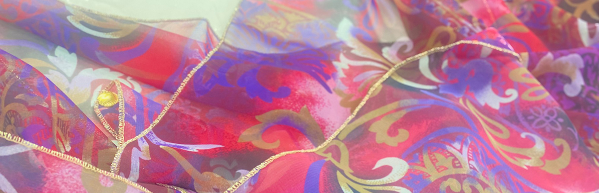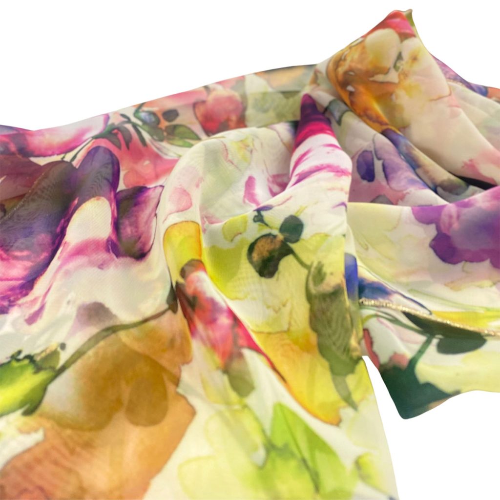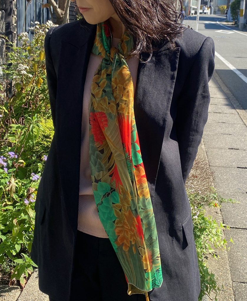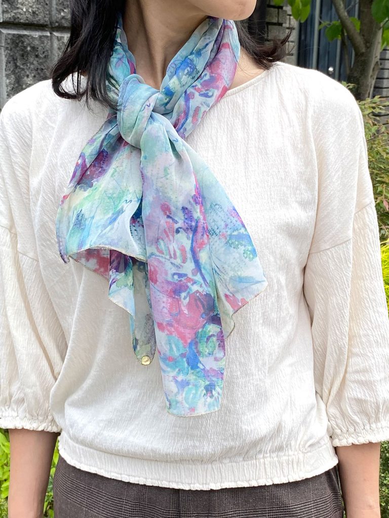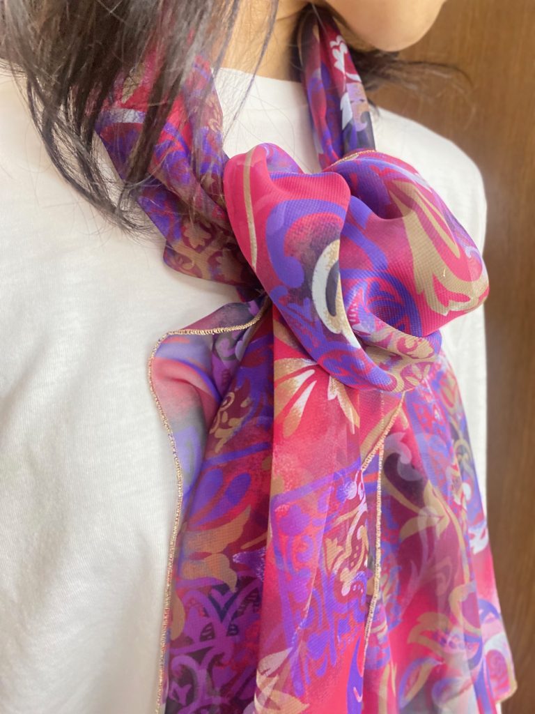 華やかに顔まわりを飾る、オリジナルデザインのプリントスカーフです。